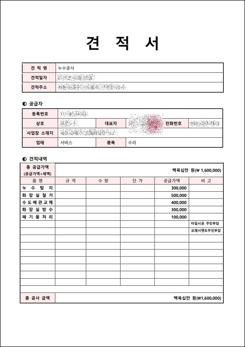 견적서와 누수공사확인서는 업체마다 양식이 다르니 공사업체에 요청하시면 됩니다. 견적서를 보면 세부내역에 철거비, 탐지비 등이 적혀있는 것이 있습니다. 이를 정확히 기재해 달라고 요청하셔서 보험사에 제출하시면 됩니다.
